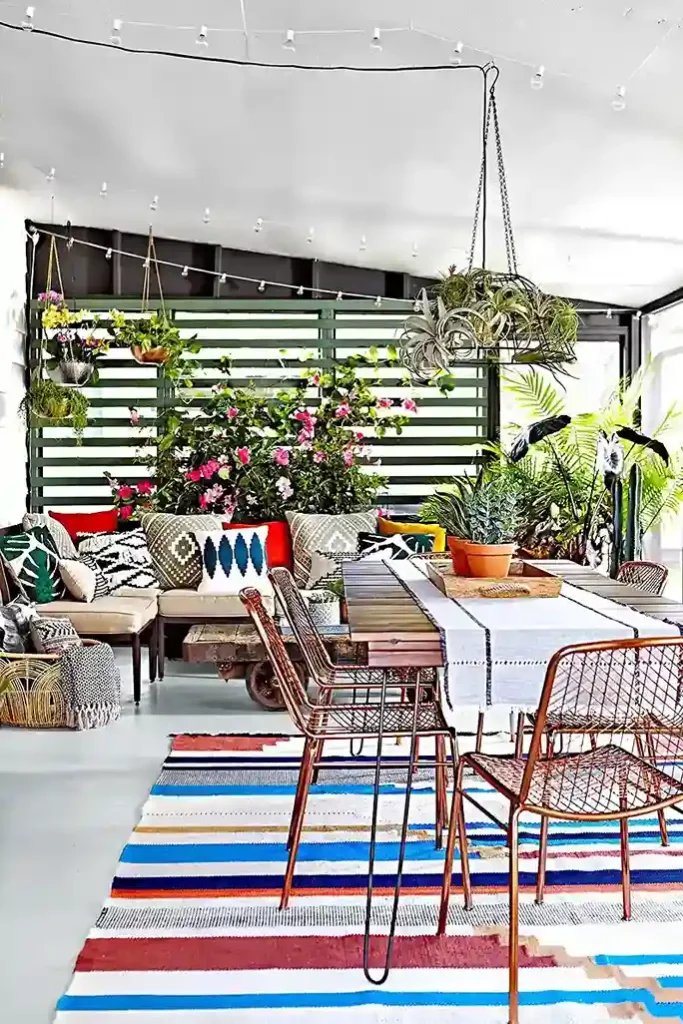 A vibrant striped rug and eclectic throw pillows bring a world of color to this screened-in porch dining area. Hanging air plants and a unique cage-style light fixture add plenty of personality and visual height.