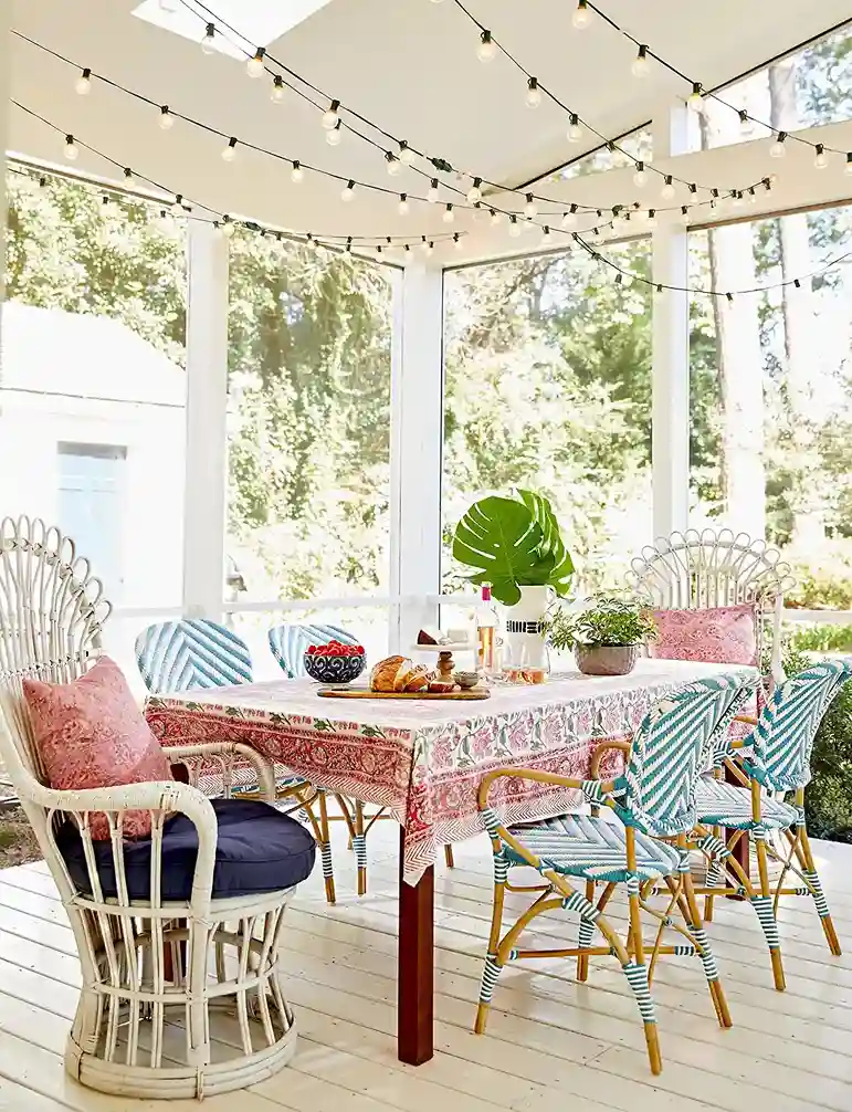 The vibe is romantic and celebratory. Stringing lights in a zig-zag pattern across your ceiling is the fastest way to make your porch feel ready for a party.