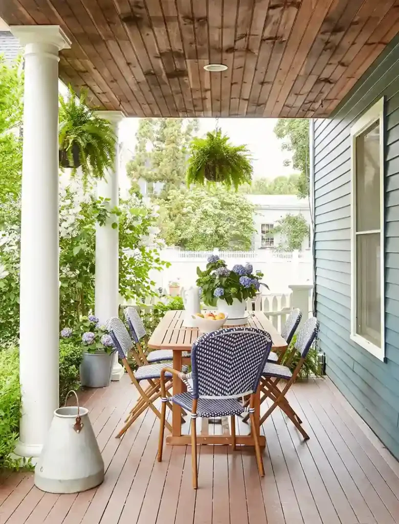 Blue and white bistro chairs surround a simple teak table on a porch that overlooks a lush garden of hydrangeas. Hanging ferns and white columns provide a classic frame for the outdoor dining experience.