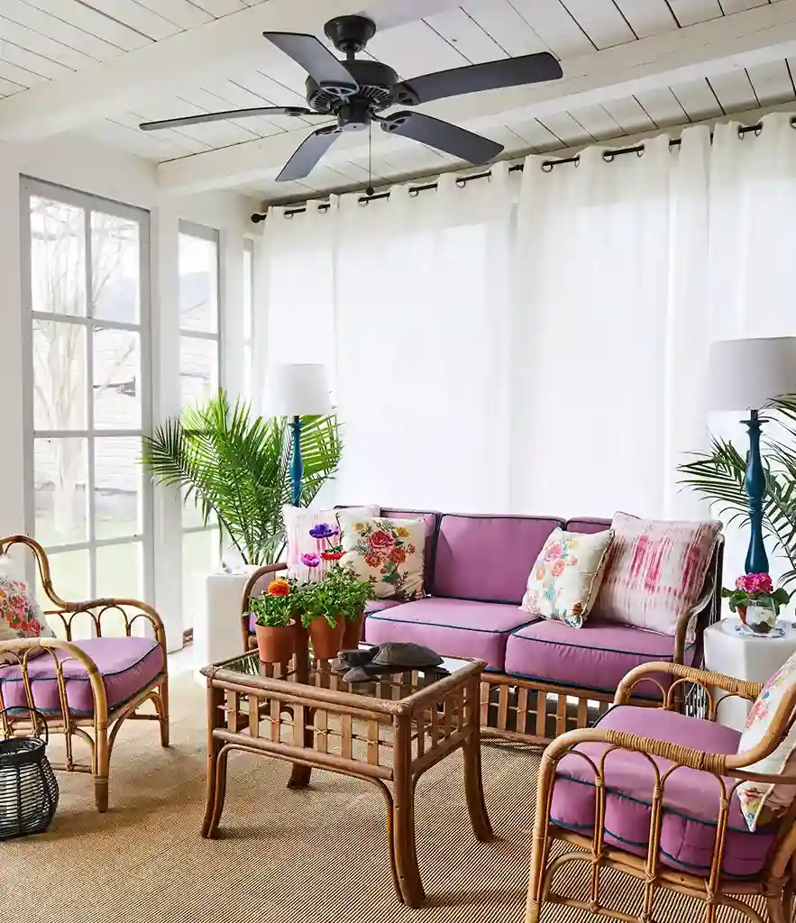 This space features a beautiful wood-planked ceiling and a copper-toned ceiling fan that adds a touch of metallic glow. A wicker sofa is updated with bold striped and floral pillows that lean into a classic “Preppy” aesthetic.