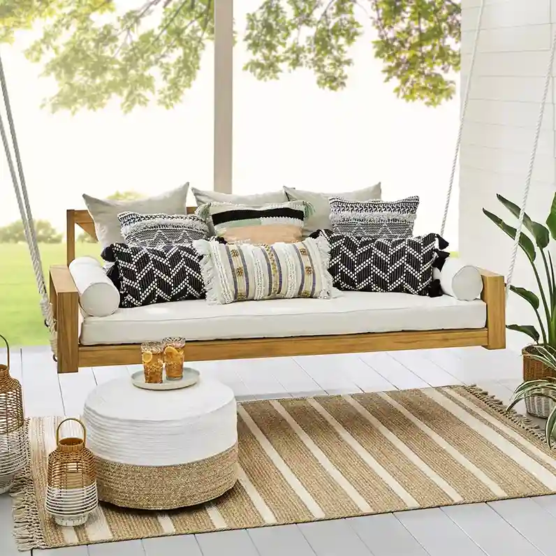 A simple wooden daybed is suspended by thick ropes and styled with monochrome patterned pillows for a sleek look. The clean lines and limited color palette make it feel modern and sophisticated.