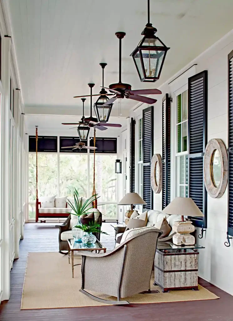 This long porch features a row of dark wood ceiling fans and matching lanterns that create a stunning sense of rhythm. Large shutters and oversized mirrors on the walls make the space feel like a formal gallery.