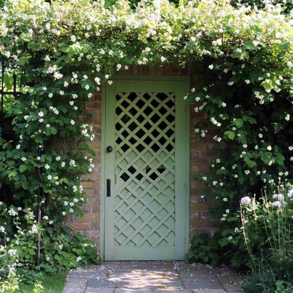 This light green door features a full-length diamond lattice design that allows scent and light to pass through easily. It is framed by a brick wall and a massive overflow of white jasmine or climbing roses.