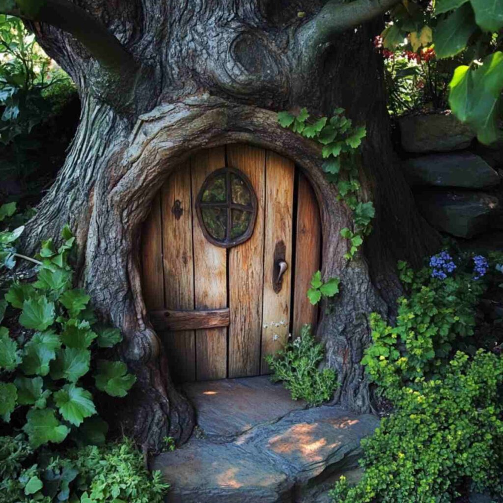 This enchanting door is built directly into the base of a massive, ancient tree, with the gnarled bark forming a natural frame. A tiny circular window with a crossbar adds to the “storybook cottage” aesthetic.