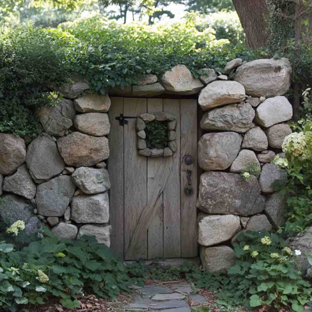 This unique door is built directly into a wall of massive, unhewn boulders and topped with a living roof of moss and shrubs. A small, square window in the door is framed by stones, allowing a tiny glimpse of the greenery beyond.