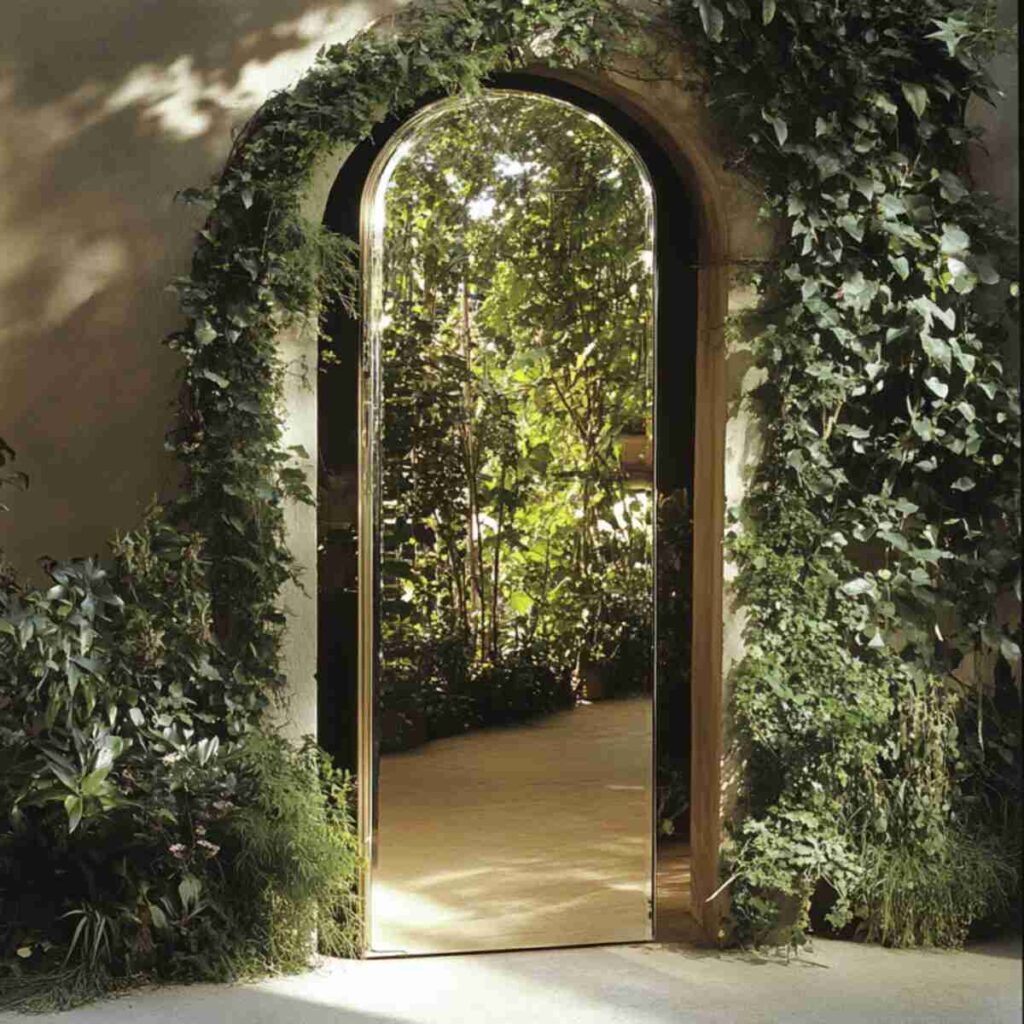 In a brilliant twist, this arched entrance features a reflective surface that mirrors the lush trees and sunlight of the garden. Framed by delicate climbing vines, the door creates the illusion of a never-ending forest path.