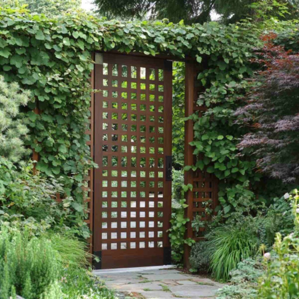 The mood is sophisticated and contemporary, proving that “secret gardens” don’t always have to look like they are hundreds of years old. A simple DIY version involves adding wooden slats to a basic metal gate frame for a high-end look.