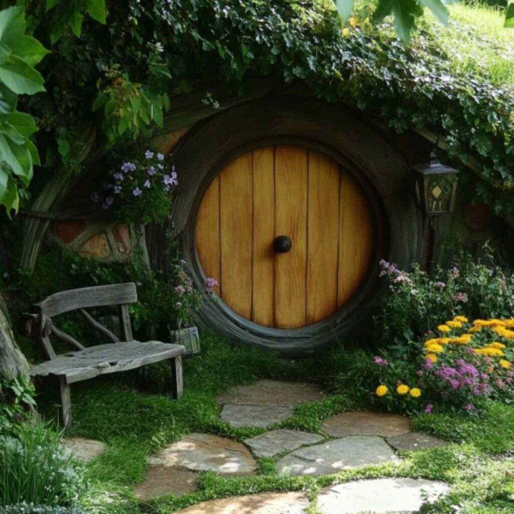 Picture a weathered wooden door tucked behind a curtain of ivy or a round hobbit-style entrance surrounded by bright yellow wildflowers. These little details turn a simple walkway into a journey that feels intentional and magical.