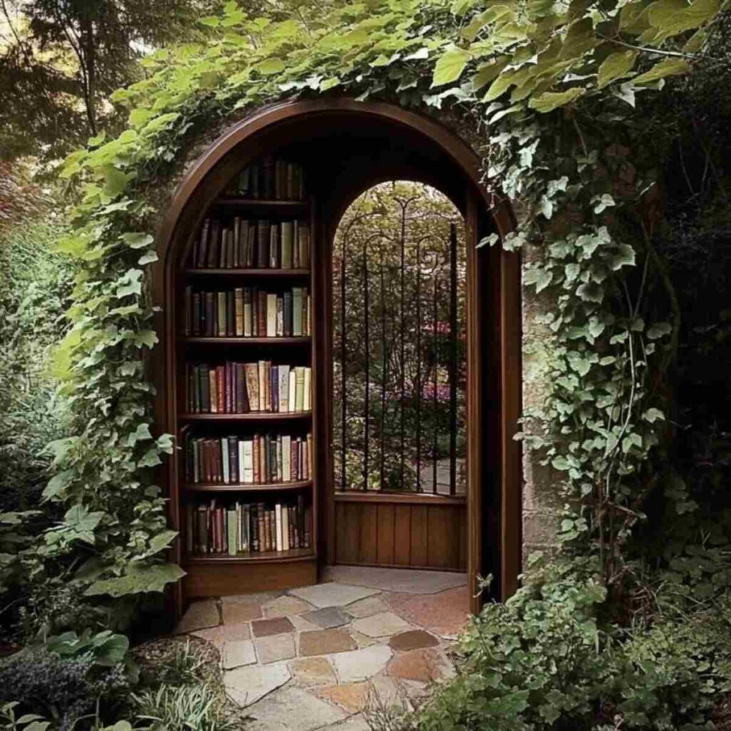 Perhaps the most magical of all, this entrance features a hidden door disguised as a curved bookshelf filled with vintage volumes. When pushed open, it reveals a delicate wrought-iron gate leading into a shaded floral path.