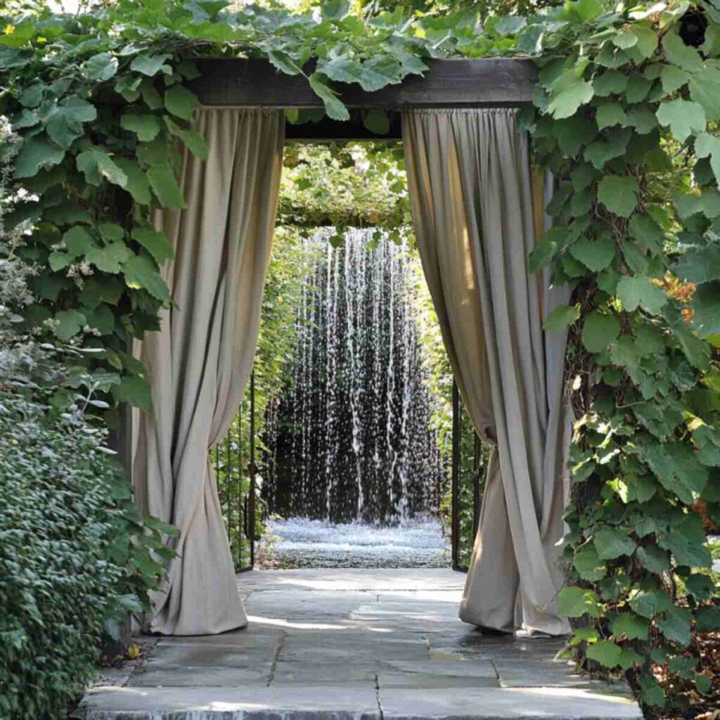 The soft fabric blowing in the breeze adds a sense of movement and romance that hard materials cannot replicate. Visually, the vertical lines of the curtains echo the falling water in the background, creating a harmonious flow.