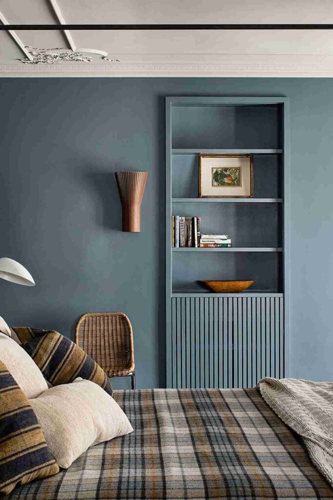 Deep slate blue walls are paired with a built-in bookshelf that is painted the exact same shade for a seamless look. The lower half of the shelf features fluted detailing, adding a subtle architectural interest to the functional storage.