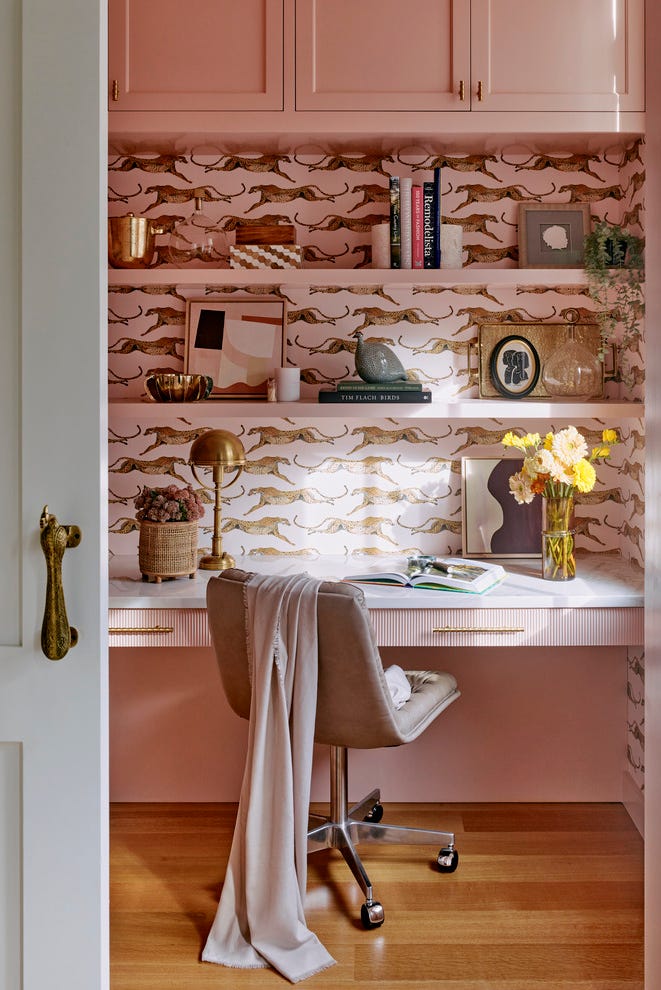 This room proves that a small nook can be transformed into a high-functioning and beautiful home office. The soft blush pink cabinetry is paired with a playful leopard print wallpaper inside the shelving area.