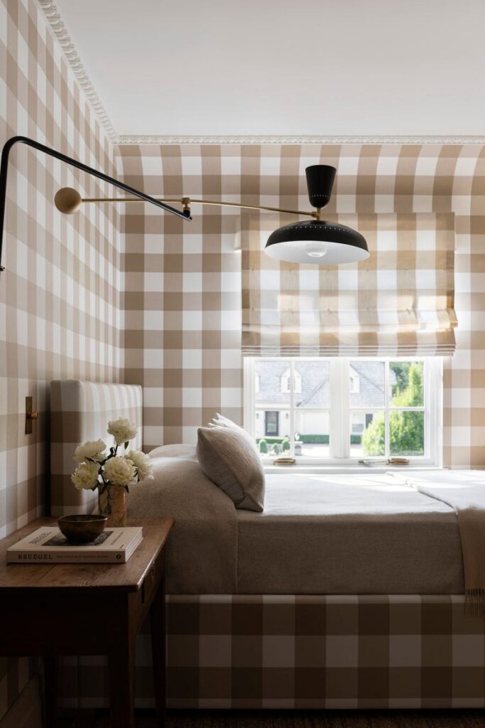 This room takes a classic tan gingham pattern and applies it to the walls, headboard, and even the bed base for a bold, enveloped look. The continuous pattern blurs the lines between furniture and architecture, which helps the small room feel more expansive.