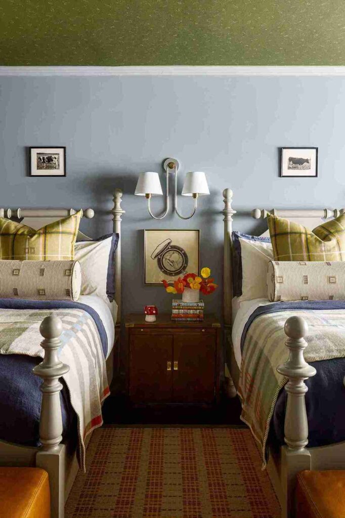 Symmetry is the star of this room, featuring two identical twin beds separated by a single dark wood nightstand. The cool blue-grey walls are grounded by a green textured ceiling, adding an unexpected layer of color that makes the room feel sophisticated.