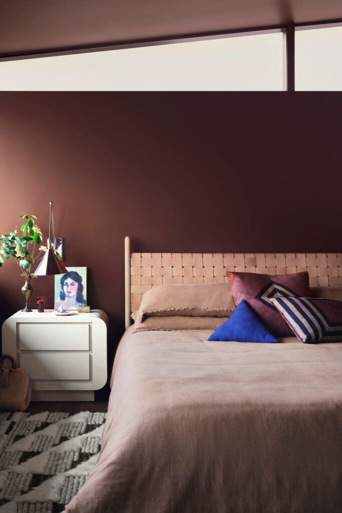 This room leans into a deep, delicious chocolate brown for the walls and ceiling, creating a moody and intimate atmosphere. A woven leather headboard adds a rich texture that stands out against the smooth matte paint.