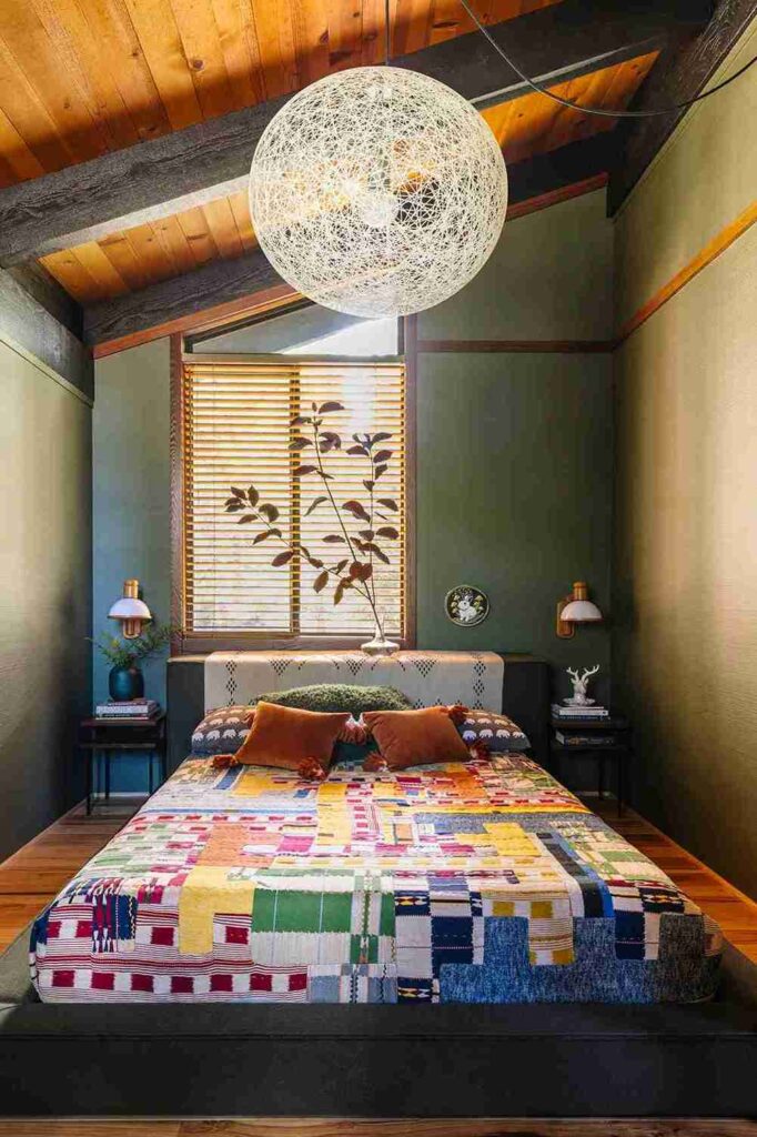 High vaulted wood ceilings and olive green walls create a stunning architectural foundation for this eclectic bedroom. A vibrant, multi-colored patchwork quilt serves as the ultimate statement piece, bringing a sense of history and warmth.