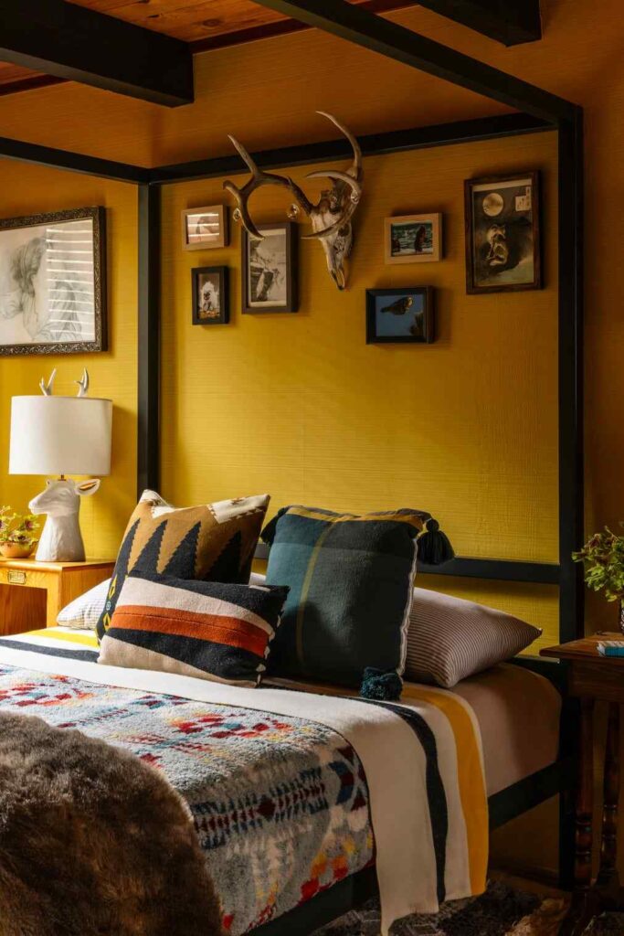 This bedroom embraces a bold mustard yellow backdrop that instantly warms up the entire sleeping area. A black four-poster frame provides a sharp graphic contrast against the soft walls, while a curated gallery of small frames and a centered antler piece add a touch of woodland charm.