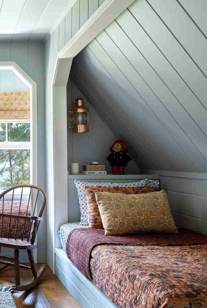 Tucking a bed directly into the slope of an attic creates an incredibly intimate and functional sleeping zone. The soft dusty blue paneling on the walls and ceiling wraps the space in a calming monochromatic hug.