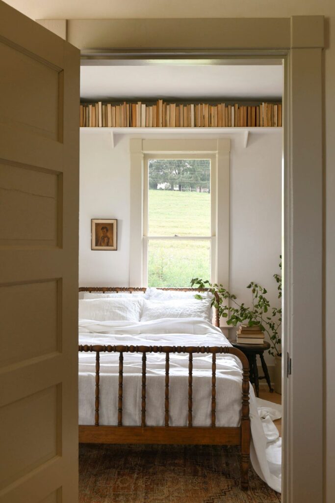 This airy white bedroom solves the storage dilemma by installing a long bookshelf high above the window frame. The natural wood bed frame sits centrally under the light, surrounded by soft white linens that make the room feel much larger.