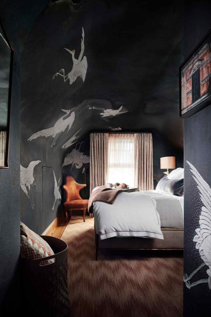 Bold choices can work beautifully in small spaces, as seen in this dark, moody room featuring a ceiling-to-wall crane mural. The deep charcoal tones make the corners of the room recede, which can actually make a narrow space feel more expansive.