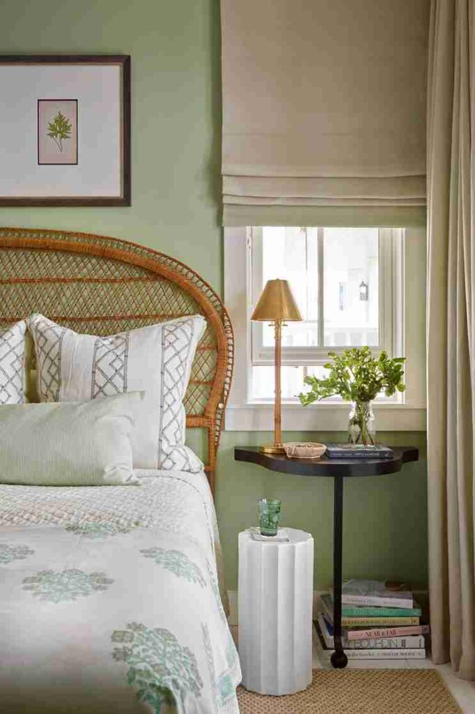 A statement oversized rattan headboard serves as the focal point of this refreshing sage green bedroom. The light wood textures of the headboard and the bamboo-style lamp base bring an organic, outdoorsy vibe inside.