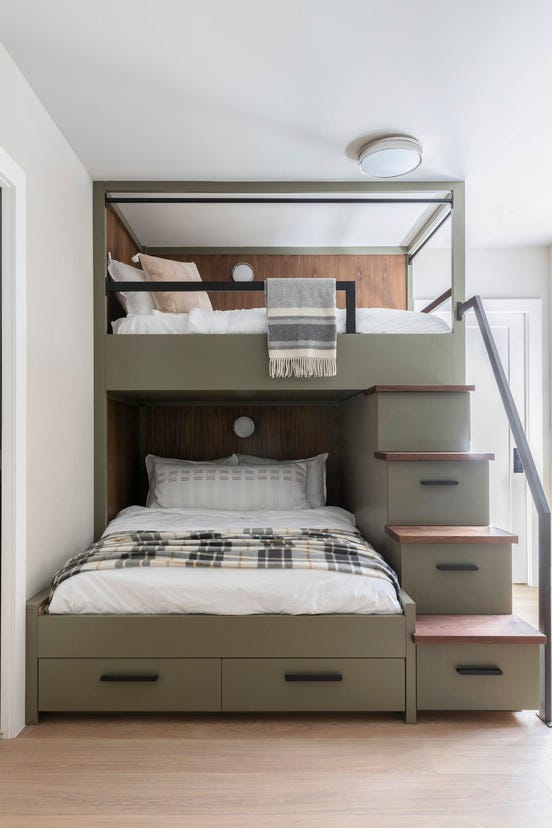 This room maximizes verticality with a custom-built bunk system in a sophisticated olive green. The sturdy stairs double as deep storage drawers, eliminating the need for a separate dresser in the room.