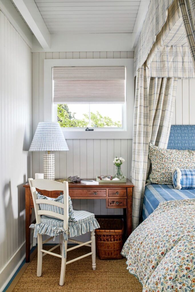 This space expertly blends a workspace with a sleeping area by placing a vintage wooden desk right next to a canopy bed. The light blue and white color palette, featuring gingham and floral prints, keeps the multi-functional room feeling cohesive.