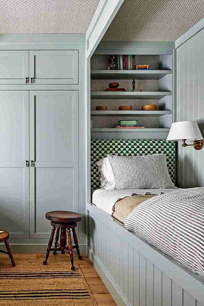This bedroom utilizes a floor-to-ceiling cabinetry system in a soft slate blue to provide massive storage without the need for extra furniture. The bed is recessed into the cabinetry, creating a built-in daybed feel with a geometric green headboard for a pop of color.