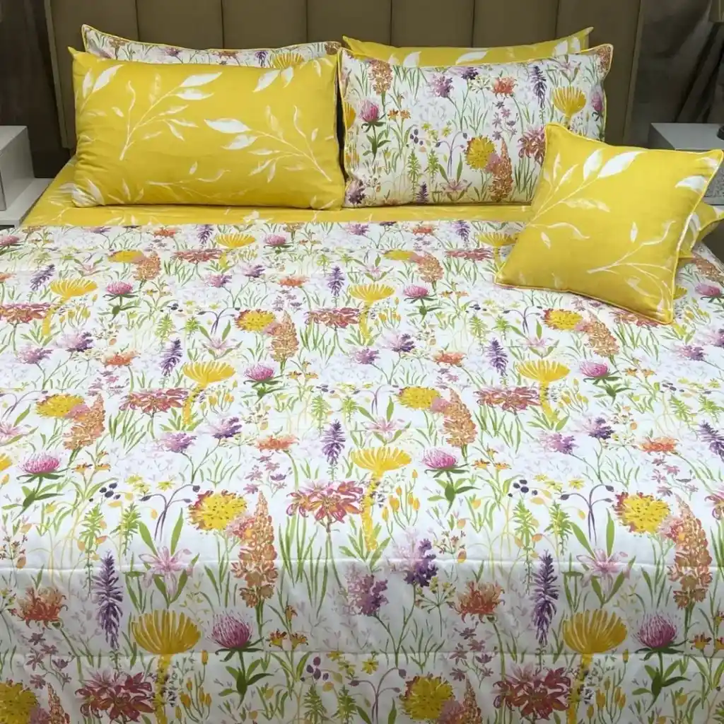 The visual charm comes from the exuberant use of color and the detailed botanical illustrations, which together evoke the feeling of a sun-drenched summer field. This bedding radiates a wonderfully happy and energetic mood, bringing the freshness and beauty of nature indoors.
