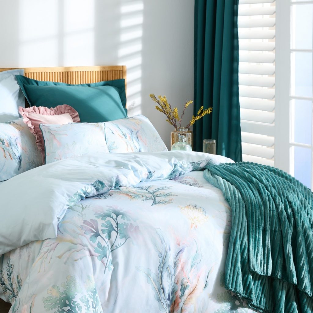 This serene bedroom features a bed adorned with a duvet cover boasting a delicate botanical print in soft greens, blues, and hints of coral, reminiscent of an underwater garden. A rich teal throw blanket and matching pillows bring out the deeper hues in the print, creating a cohesive and calming palette, beautifully complemented by teal curtains.