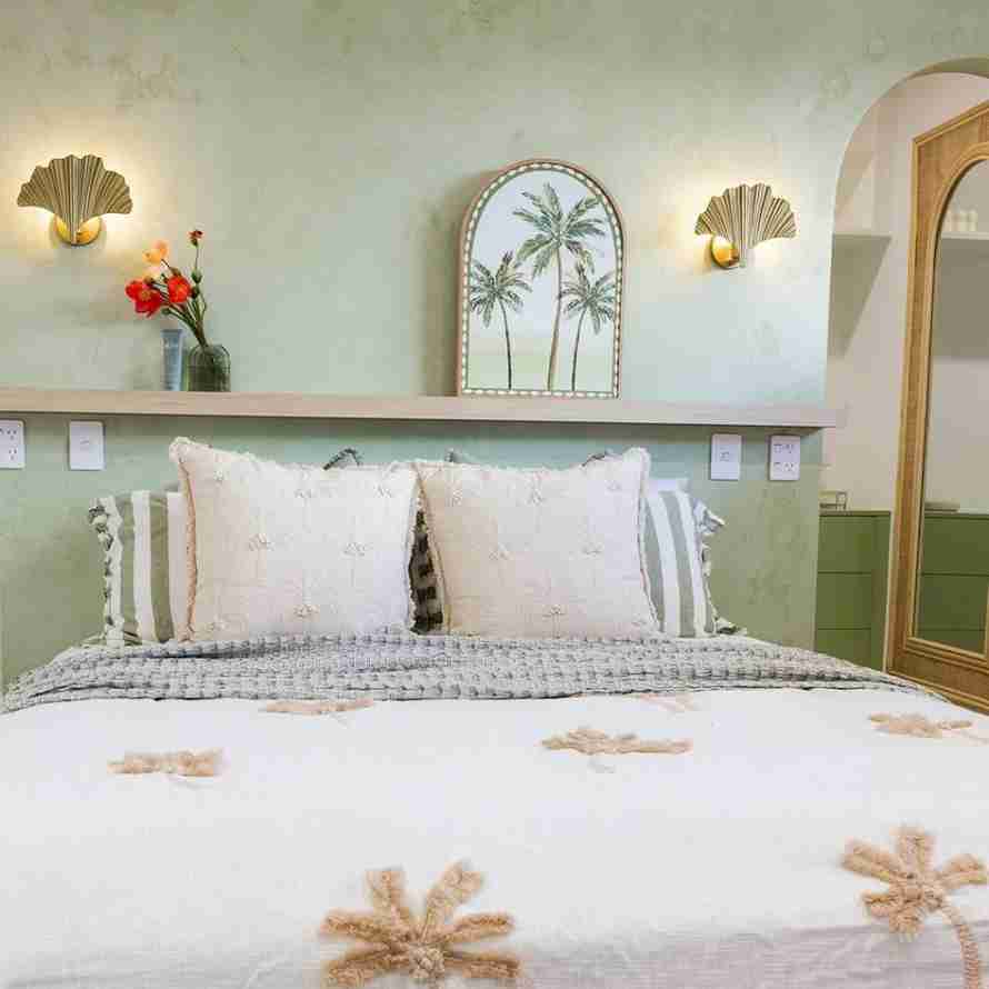 This bedroom exudes a relaxed, tropical vibe with its soft sage green textured wall and a bed adorned with white bedding featuring delicate, embroidered palm tree motifs. Large, textured white pillows and a striped throw enhance the cozy feel, while two shell-shaped wall sconces and a framed palm tree print above the bed complete the theme.