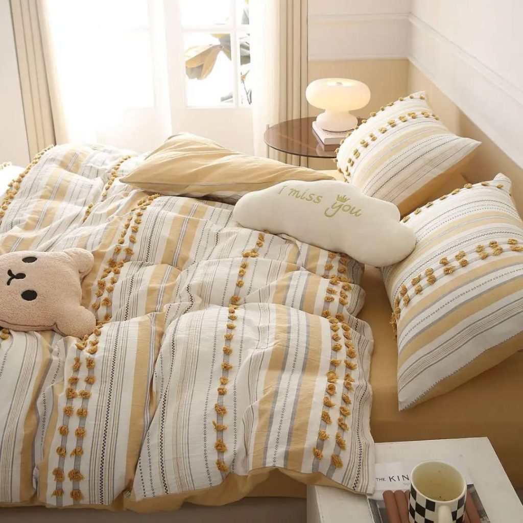 This close-up captures a cheerful bedding set featuring yellow and white stripes adorned with delightful yellow pom-pom accents, bringing a playful texture to the duvet and pillows. A sweet cloud-shaped pillow embroidered with “I miss you” and a bear-shaped cushion add extra touches of whimsy and cuteness.