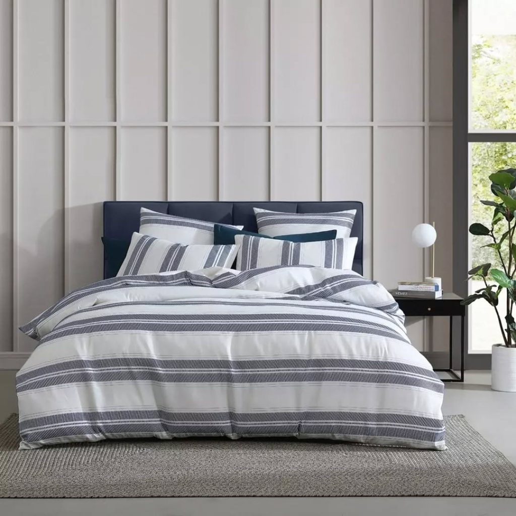 A modern bedroom setup features a striking duvet cover with bold horizontal navy and white stripes, creating a crisp and graphic statement. Darker blue pillows underneath add depth, while a simple white lamp and a tall green plant contribute to the clean, contemporary aesthetic.