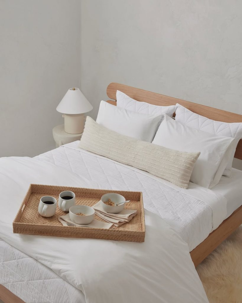 This image showcases a beautifully minimalist bedroom with a bed dressed in pristine white bedding, accented by a long textured lumbar pillow and a simple quilted coverlet. A light wooden headboard and subtle side table with a lamp maintain the clean aesthetic, while a woven tray with coffee and cereal invites a slow morning.