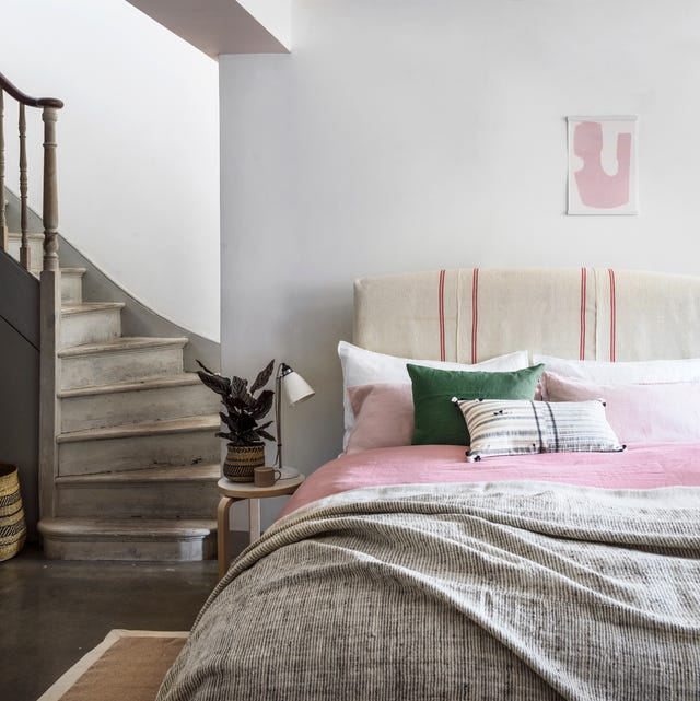 Here we see a casually made bed featuring a lovely soft pink duvet cover, layered with a grey striped throw and complemented by a deep green cushion and a black and white patterned pillow. The simple headboard with subtle red stripes adds a touch of rustic charm, while the surrounding minimalist space with a light-colored staircase gives the room an airy feel.