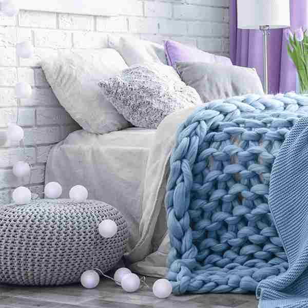 A cozy corner of a bedroom is highlighted, featuring a super chunky light blue knit throw draped over crisp white bedding, creating an irresistible texture. A matching grey knitted pouf and a string of soft glowing orb lights add to the soft, inviting ambiance, set against a white brick wall.