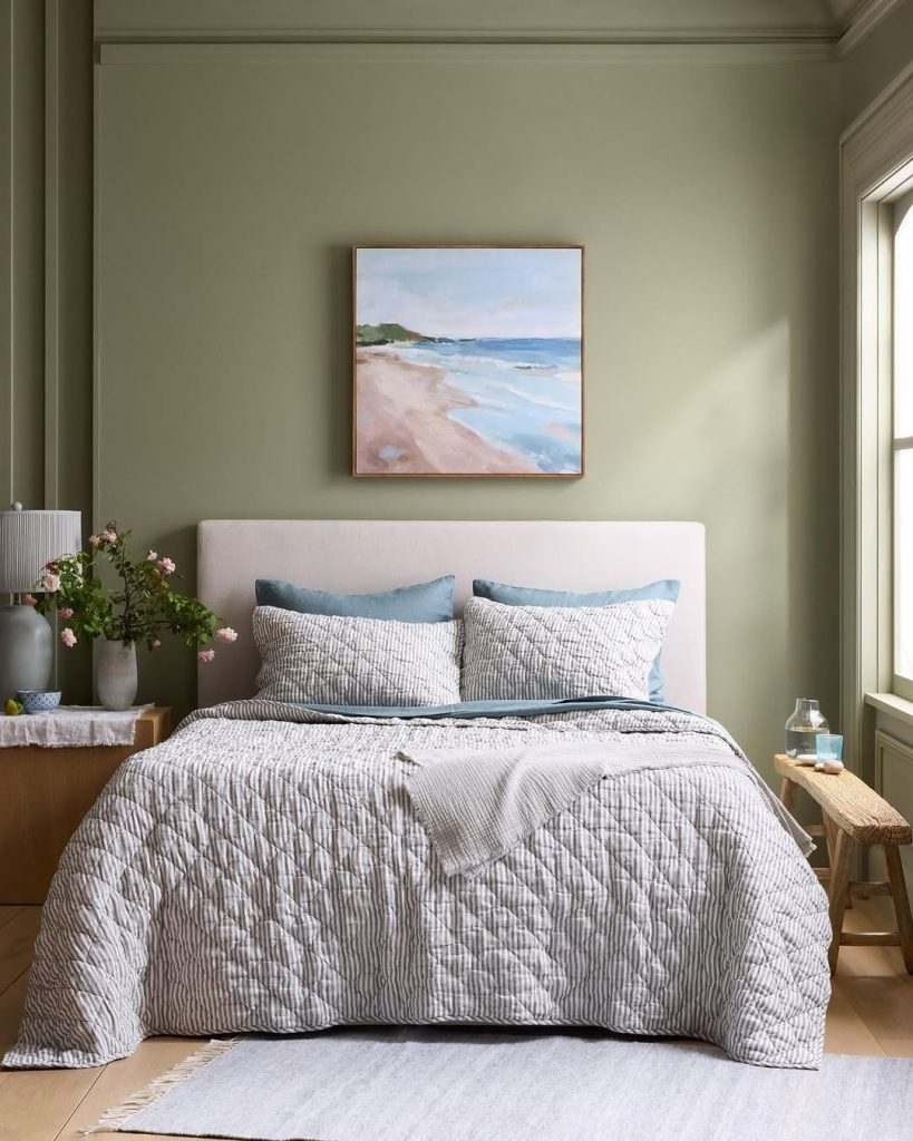 A beautifully composed bedroom is shown here, featuring a bed dressed in a subtly striped, quilted coverlet in soft white and grey tones, paired with pale blue pillows. The room’s walls are painted a calming sage green, creating a harmonious and tranquil backdrop for the bedding.