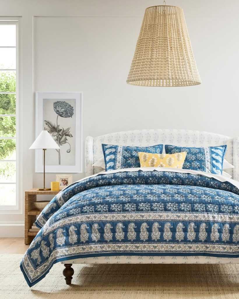 This image presents a bedroom featuring an elegant blue and white paisley patterned quilt and matching pillows, beautifully paired with an upholstered headboard that echoes the gentle blue tones. A small yellow accent pillow adds a cheerful pop of color, while a rattan side table and pendant light introduce natural textures.