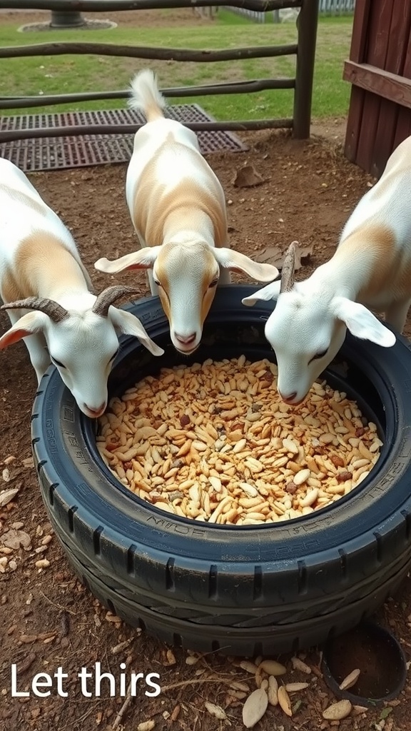 Using an old tire as a feeding trough for goats is both practical and clever. It provides a sturdy, weather-resistant option that can hold a good amount of food. In the image, you can see three curious goats gathered around a tire filled with tasty snacks. This setup keeps the food off the ground, minimizing waste and keeping it clean.