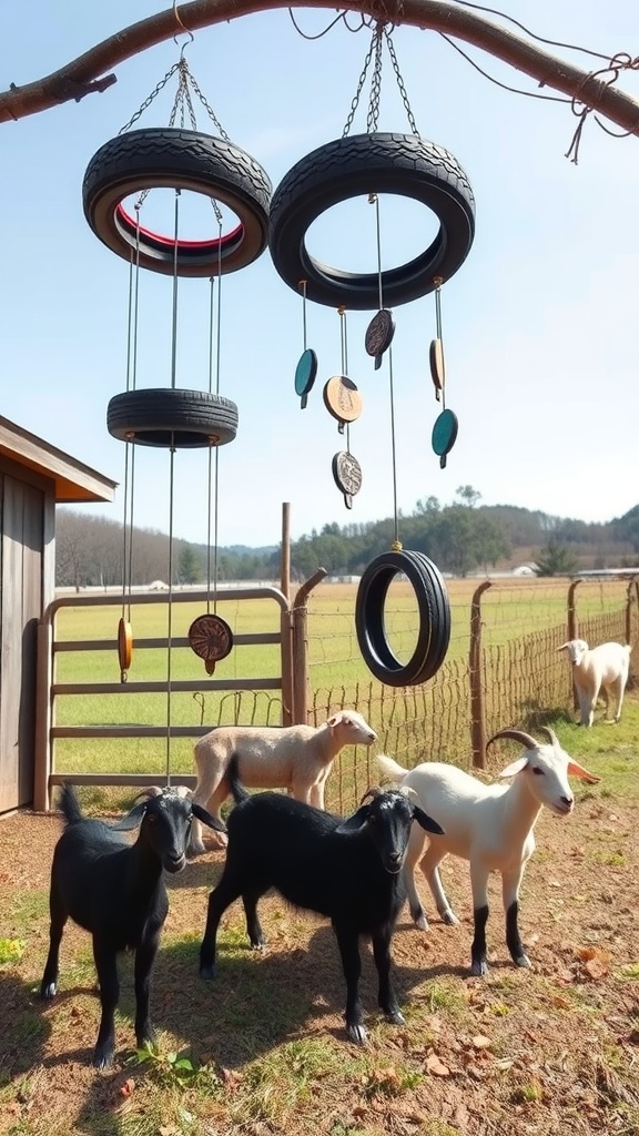 In the photo, you can see goats exploring their surroundings. They seem curious about the hanging tires, which can make for a playful environment. These wind chimes not only look great but also produce soft sounds when they move, adding a musical element to your farm.