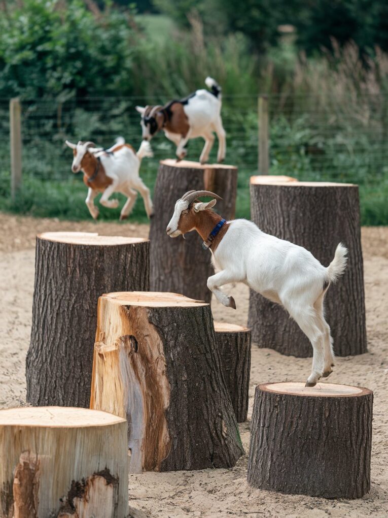 The playground is designed to encourage natural behaviors in goats. They are social animals, and playing in a group helps them bond with each other. This setup not only entertains them but also keeps them physically active, which is essential for their health.