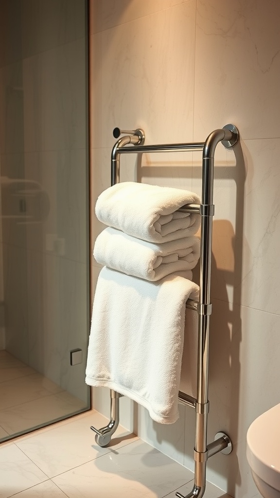 The image here showcases a sleek, polished towel rack holding neatly stacked towels. The modern design complements a clean bathroom aesthetic, creating a serene environment. Towel racks can blend seamlessly into your bathroom decor while providing much-needed warmth.