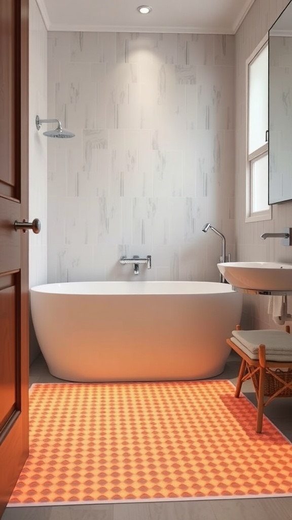 Combining bold patterns with a clean, modern bathtub and sink provides an interesting contrast. The sleek fixtures balance the vibrant tiles, making the space feel both inviting and stylish. If you’re considering a bathroom makeover, think about how you can incorporate similar tile designs to add personality and warmth to your own space.